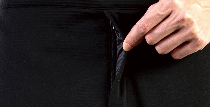 「一度濡れてしまうと乾くまで相当な時間を必要とする」フリースの欠点を克服した、常識を覆す「起毛素材」。見た目では、一般的なフリースとの違いはわかりにくいですが、行動着としての快適さは段違い。表層と起毛糸を完全に分離させた構造で、素早く吸い上げた水分を即座にベース層に移行させて拡散・蒸発させる、これまでにない優れた汗処理機能を実現させています。