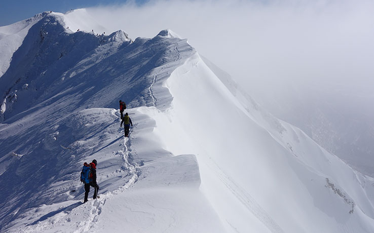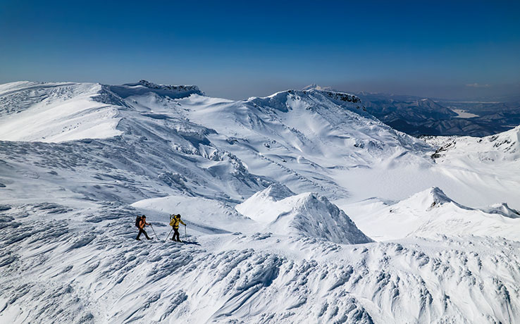 青く澄み渡った空と白く輝く稜線、一歩ごとに踏みしめる雪の音だけが響く——。