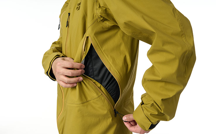 雪山の極限環境に挑むための高機能ハードシェル。防水透湿性に優れたエバーブレス®素材に加え、背面には縦137%・横196%の超ストレッチ「エバーブレス®︎ニット」が配置され、ラッセルやアックス操作も快適に行えます。